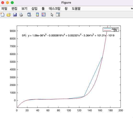 그 결과값들을 근사해 출력한 결과 다음과 같은 5차식이 나왔습니다.
