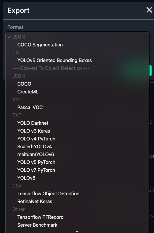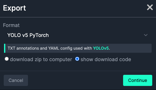 포맷을 입력하는 칸이 나옵니다. 제 포스팅의 경우 YOLO V5를 이용하므로 YOLO V5 PyTorch를 눌러주시면 됩니다.