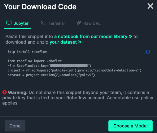 continue를 누르시면 다음과 같은 창이 뜹니다. 이 코드들을 복사해서 붙여넣기 하시면 데이터셋을 다운로드받으실 수 있습니다.