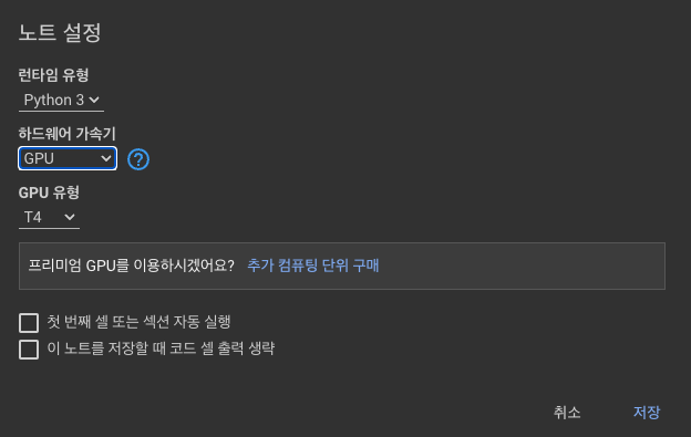 GPU사용 제한이 있어 사용이 안되는 경우가 있습니다. 이때는 다른 구글 계정을 활용하시는 것이 좋습니다.